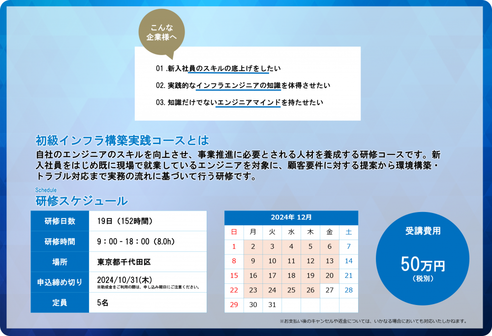 毎回ご好評頂いております「新人インフラエンジニア向け実践研修」12月開催分について、先着5名限定で申込受付を開始いたしました。