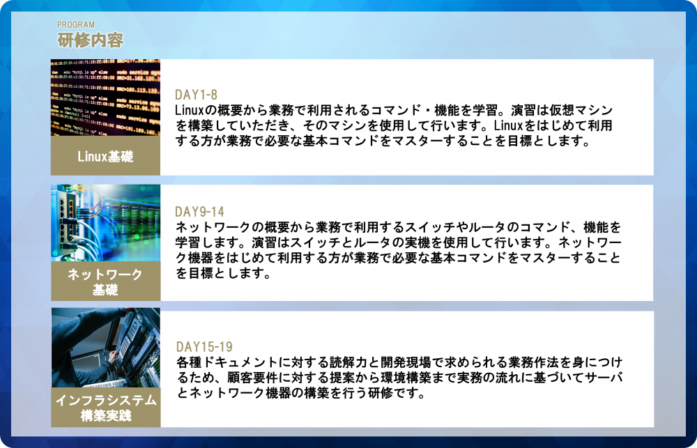 19日間の座学研修でITインフラの基礎(ネットワーク/サーバー)を学びます。
