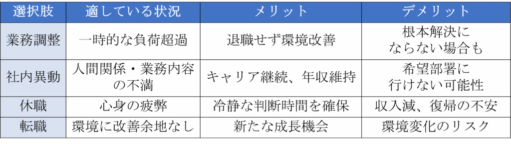 選択肢の検討では、転職、異動、休職など複数の選択肢を比較します。それぞれのメリット・デメリットを冷静に評価し、自分の状況に最適な選択を見極めましょう。