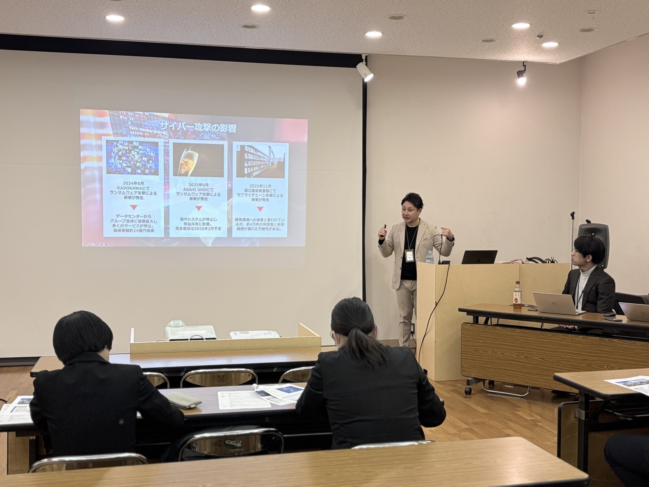 説明会では代表・横溝が登壇し、日本のセキュリティ事情や今求められるエンジニア人材についてを解説。