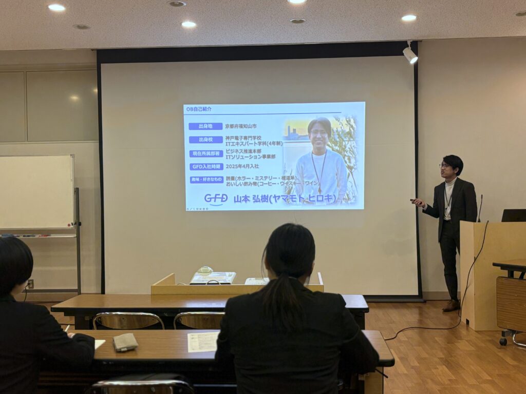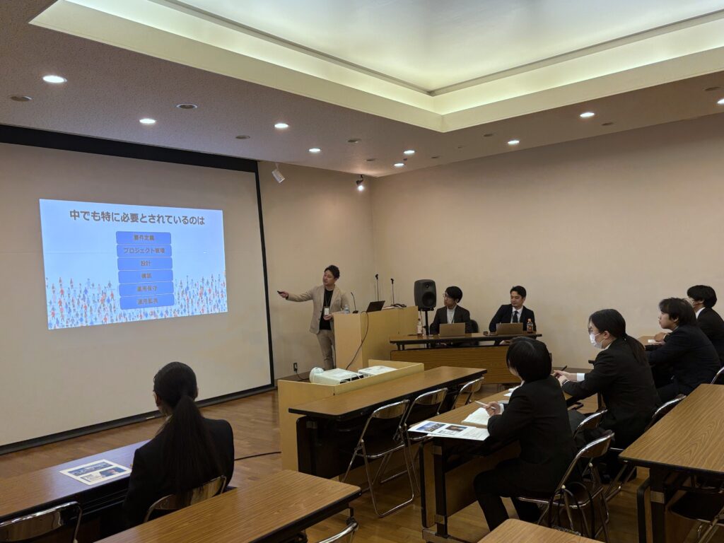 また、今回は神戸電子専門学校のOBである当社社員も登壇し、学生時代の就職活動のリアルなエピソードや、入社後のキャリアステップについて具体的にお話ししました。同じ学校を卒業した先輩のお話ということもあり、学生のみなさんが真剣に耳を傾けている様子が印象的でした。